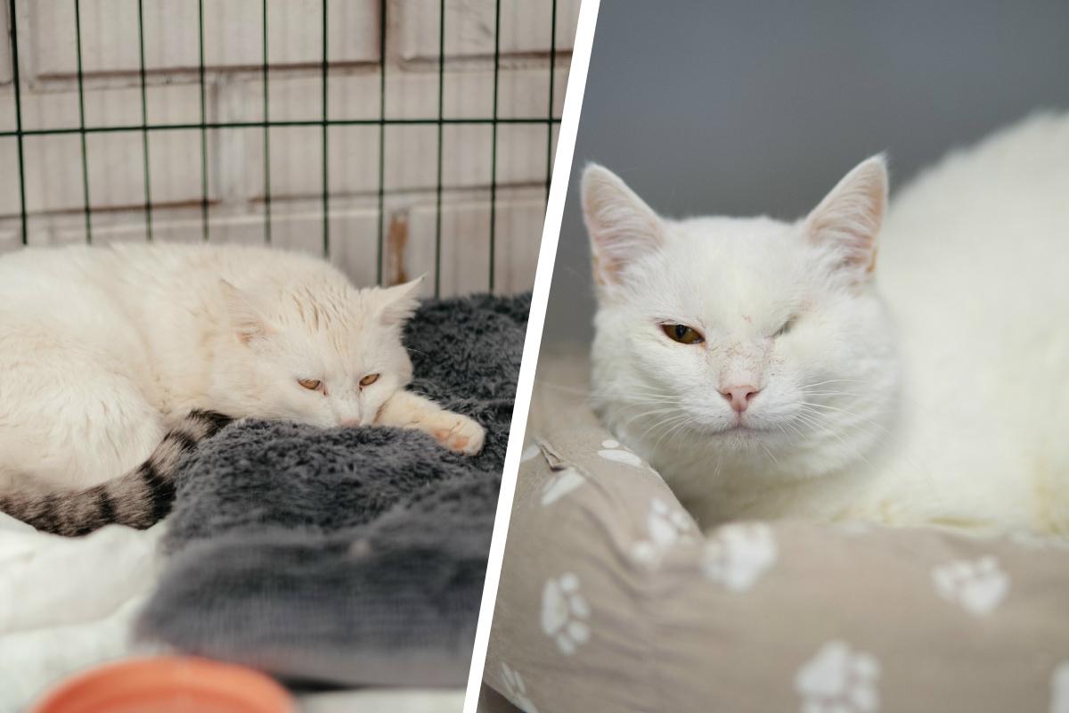 Белый кот с полосатым хвостом и одним глазом не может жить с сородичами из-за заболеваний и долгое время находится в приюте.