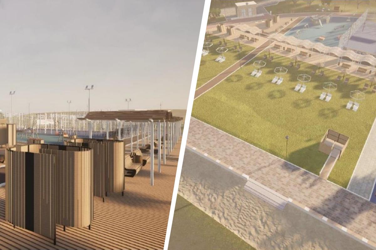 Согласно опубликованным эскизам, на площади более 8 тысяч квадратных метров разместят песчаную зону с деревянными настилами, кабинки для переодевания, душевые, туалеты и комнату для матери и ребёнка. Также предусмотрены скамейки, зарядные устройства для гаджетов, тренажёры, детская площадка с безопасным покрытием и спасательный пункт. По периметру оборудуют экотропу с зонами отдыха.