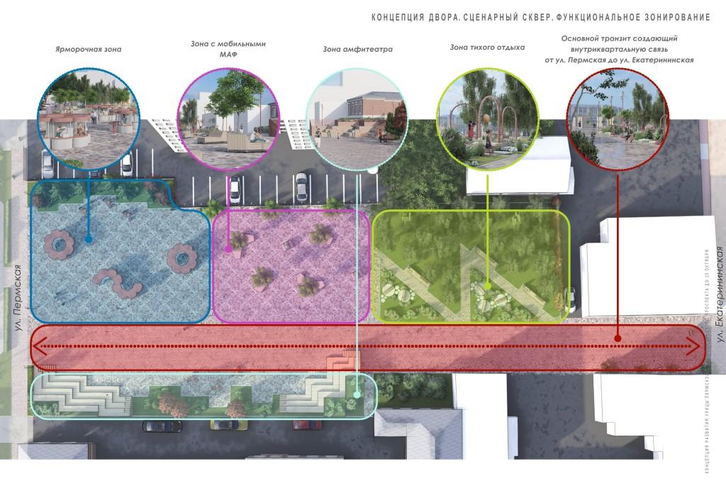 Разработка будет вестись на основе концепции «Пермская улица от Комсомольского проспекта до ул. 25 Октября», созданной Институтом территориального планирования. Эта концепция предполагает, в частности, возвращение части Пермской улице статуса пешеходной зоны, за которую её когда-то называли «Пермским Арбатом». Запланированный Сценарный сквер является частью данного плана.